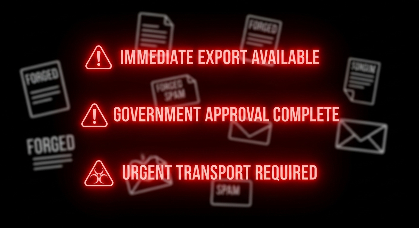 FBI 인터넷 범죄 신고 센터와 인터폴이 경고하는 선입금 사기의 전형적인 템플릿입니다. 이런 패턴의 사기는 보통 이렇게 진행됩니다. "즉시 수출 가능"으로 신뢰를 얻고, "정부 승인 완료"라는 위조 공문으로 공신력을 연출한 뒤, "긴급 운송"으로 검토 시간을 차단합니다. 그리고 운송비, 관세, 뇌물 명목으로 선입금을 요구하고, 돈이 송금되는 순간 연락이 끊깁니다.