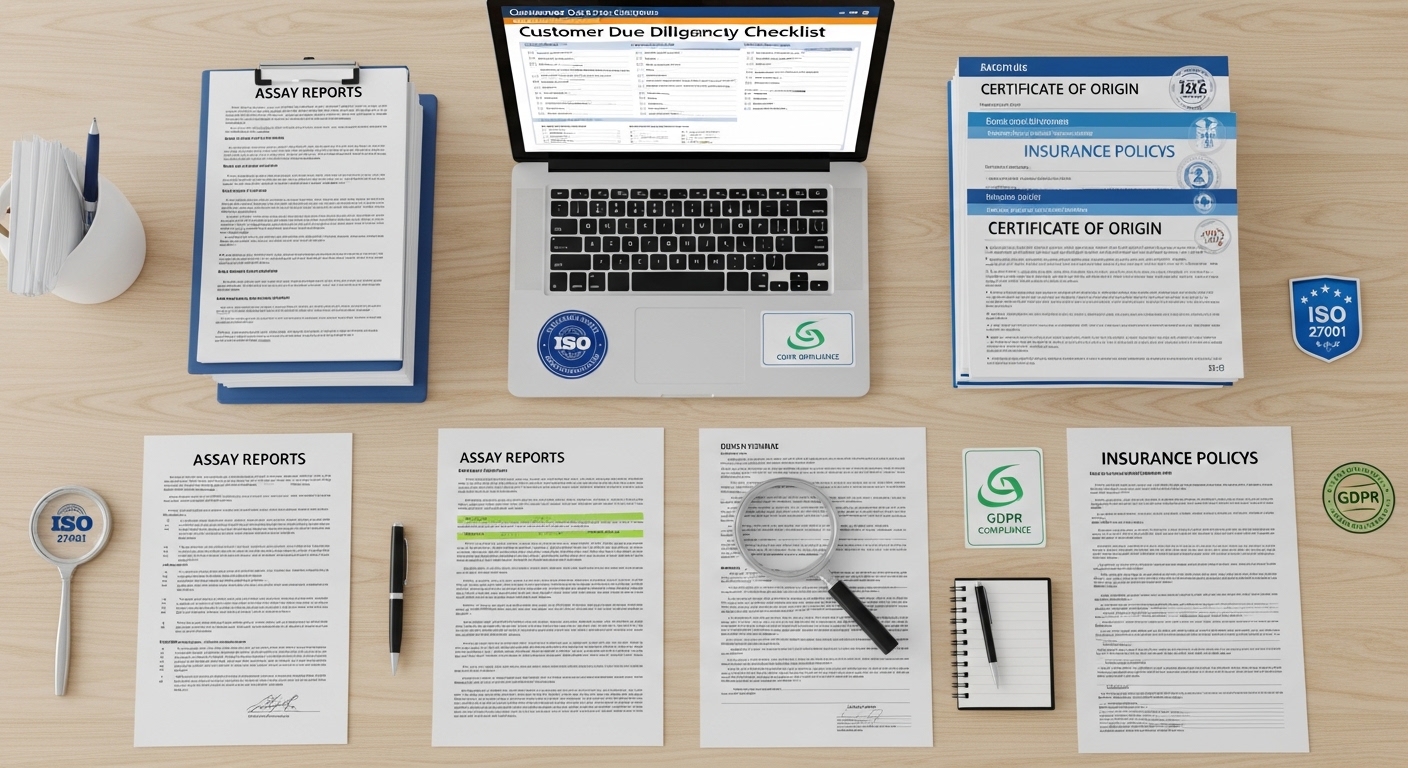 런던 금시장 협회(LBMA) 표준은 고객 확인 절차(KYC), 순도 검증서(Assay Report), 금고 보관 증명서(SKR), 정식 거래 제안서(FCO), 매매 계약서(SPA), 상품 증명서(POP) 등 복잡하고 구체적인 문서 체계를 요구합니다.